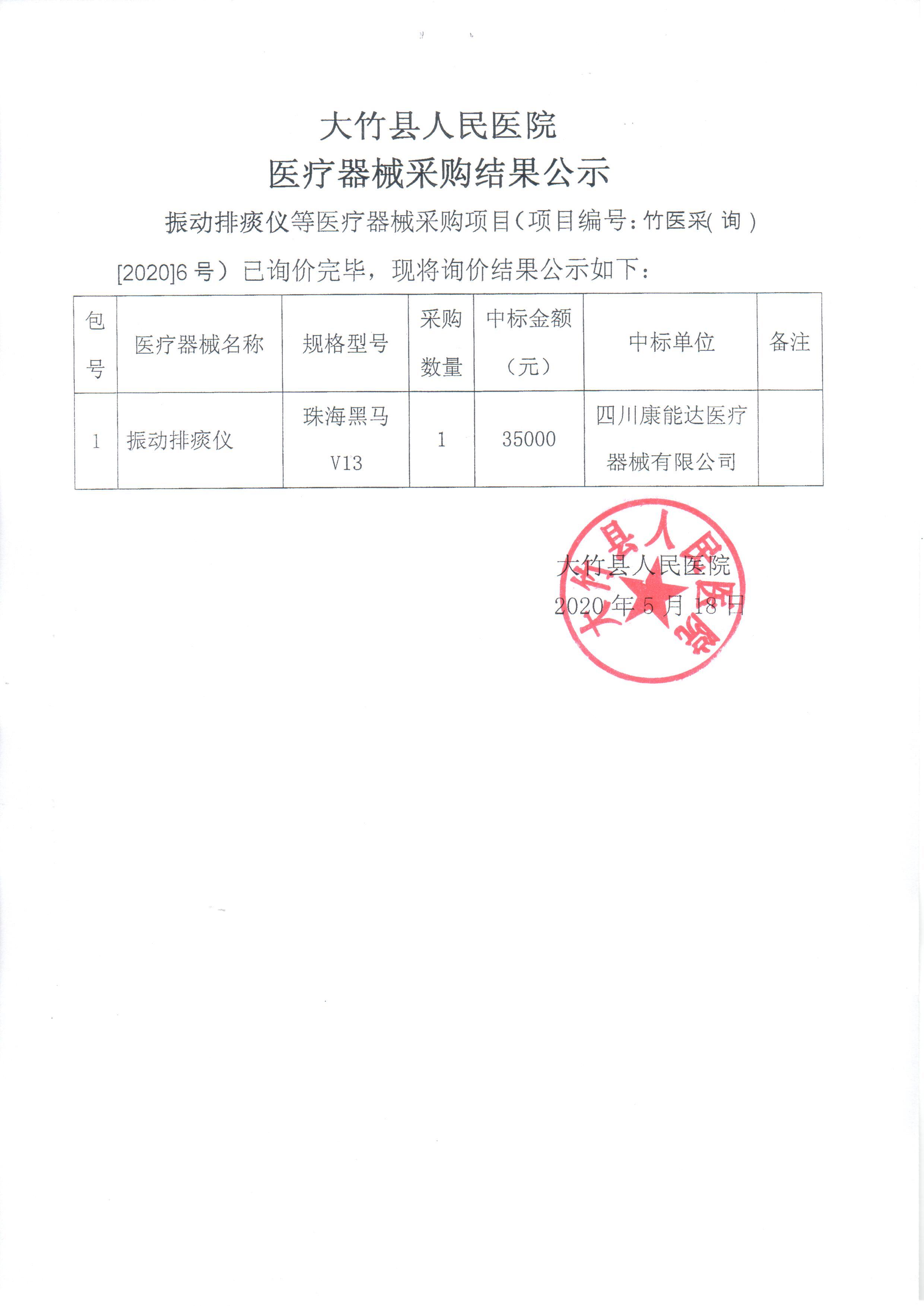 振动排痰仪医疗器械采购项目项目编号:竹医采(询)[2020]6号已询价完毕,现将询价结果公示如下: