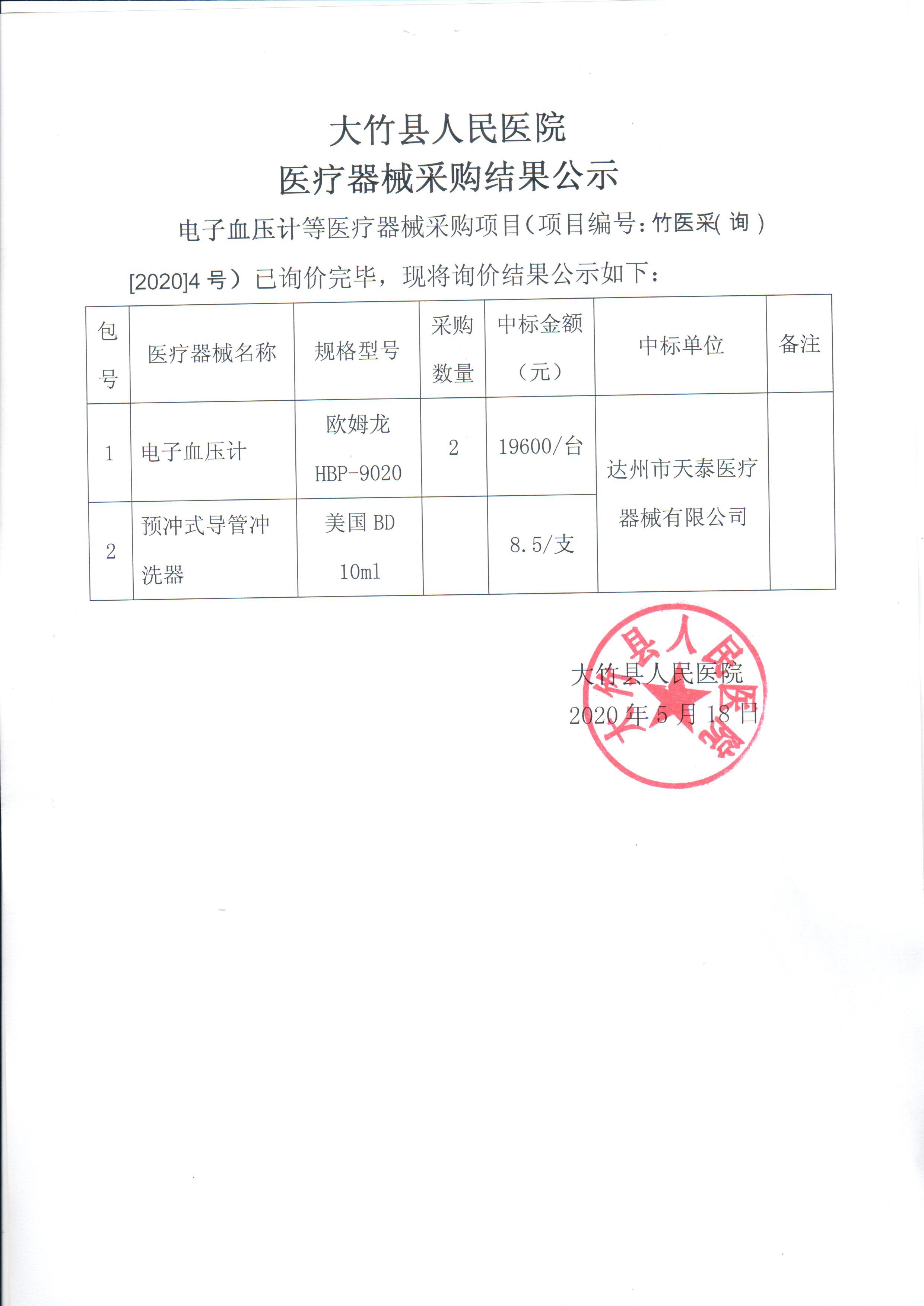 电子血压计等医疗器械采购项目(项目编号:竹医采(询)[2020]4号)已询价完毕,现将询价结果公示如下: